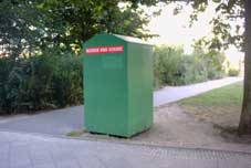 4. MÄUSE UND MENSCHEN: Auf einem grünen Container wird das Schild „Kleider und Schuhe“ durch ein Schild mit der Aufschrift „Mäuse und Menschen“ ausgetauscht.