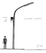 2. SCHAUKELN (UNDERGROUND): Auf dem Rasenstück vor der U-Bahn eine Kinderspielplatzschaukel aufstellen. Die Schaukelsitzbretter an langen Ketten etwa einen Meter in den Boden einlassen und eingraben. Die Ketten sollen straff gespannt sein.Zwei Schaukeln hängen unter der Decke der U-Bahn-Station, nicht notwendigerweise an der Stelle, wo das oberirdische Schaukelgestell steht, sondern irgendwo in der Station.